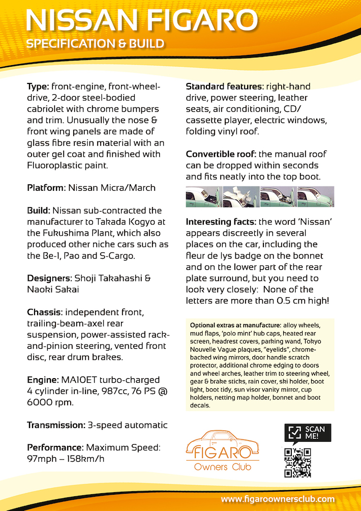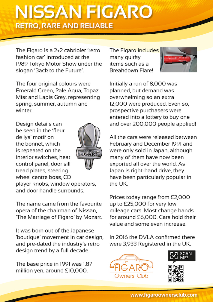 If you enjoy displaying your Figaro at events why not print off these handy A4 or A2 Posters? The posters include answers to common questions in addition to specifications & build data. Both include QR Barcodes providing a direct link to our website.