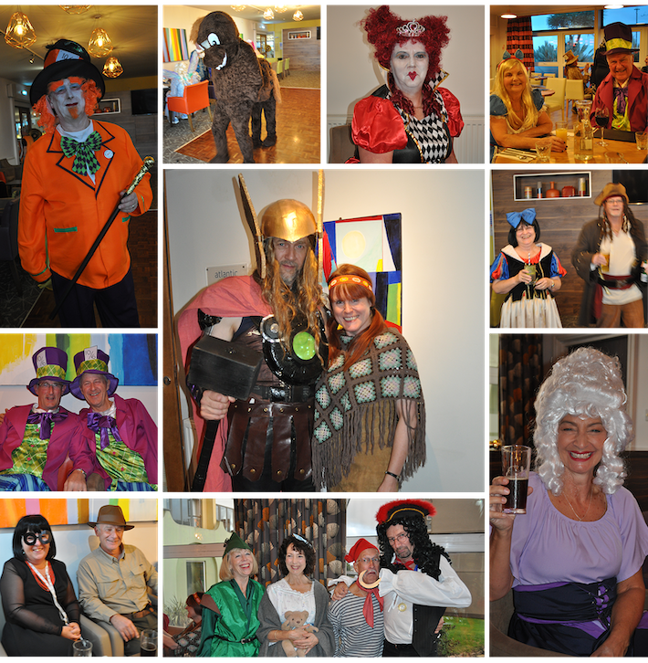 The last day was another lovely drive to The Lost Gardens of Heligan. Again pat had organised Figaro parking and we took our traditional group photo. It’s Europe’s largest garden restoration and worth a visit if you are ever in Cornwall. Sue and I took the opportunity to have our Cornish pasty fix before exploring the venue where we came across a very tame robin! The weather was great so we decided to pop down the road and check out Mevagissey Harbour. The last evening was a right cracker as we all came down to dinner in our Disney-themed fancy dress. There were some fantastic outfits see below.
