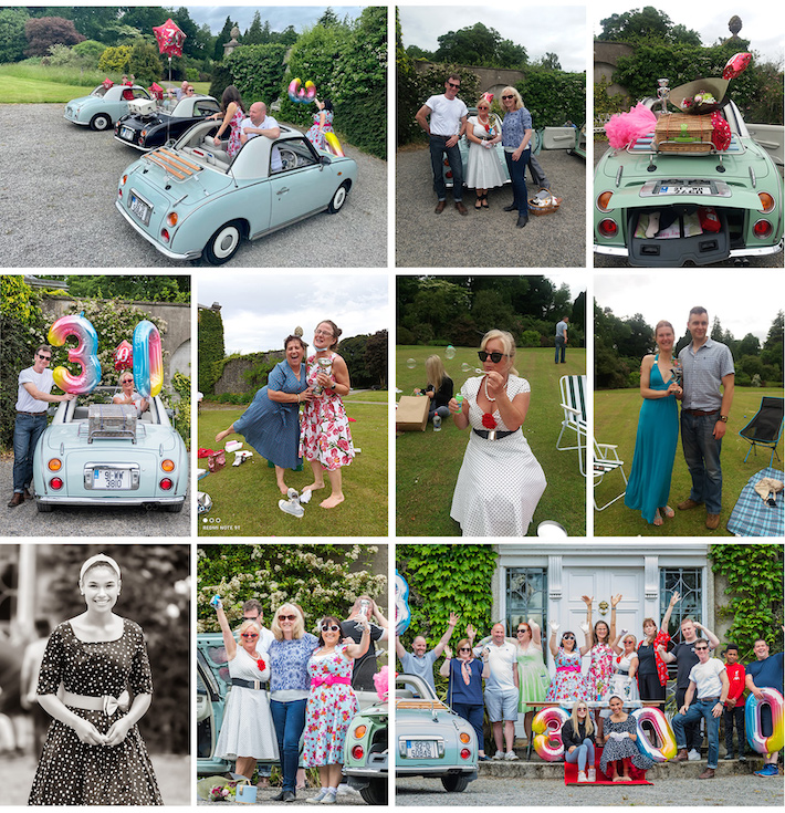 The Irish Chapter of the Figaro Owners Club came out in style on Sunday the 13th, 2021. It all started with great disappointment when me (Dolly) had to cancel the main event in England. So, I said to myself, well, we get knockdown, but we get up again, what can I do to celebrate our wonderful Figgy’s. And an idea began. I placed the idea on Facebook and our WhatsApp group. Due to Covid, we were only allowed approx. 15 people. The idea was snapped up! So, the planning began. We were lucky enough to privately book out Coolcarrigan House and gardens in Coil Dubh Co. Kildare for the day in question. We all met at the main entrance at 11.30 am and lined up accordingly with 30th balloons all swinging from our beauty’s. Everyone was dolled up to the nines in 1950s gear.