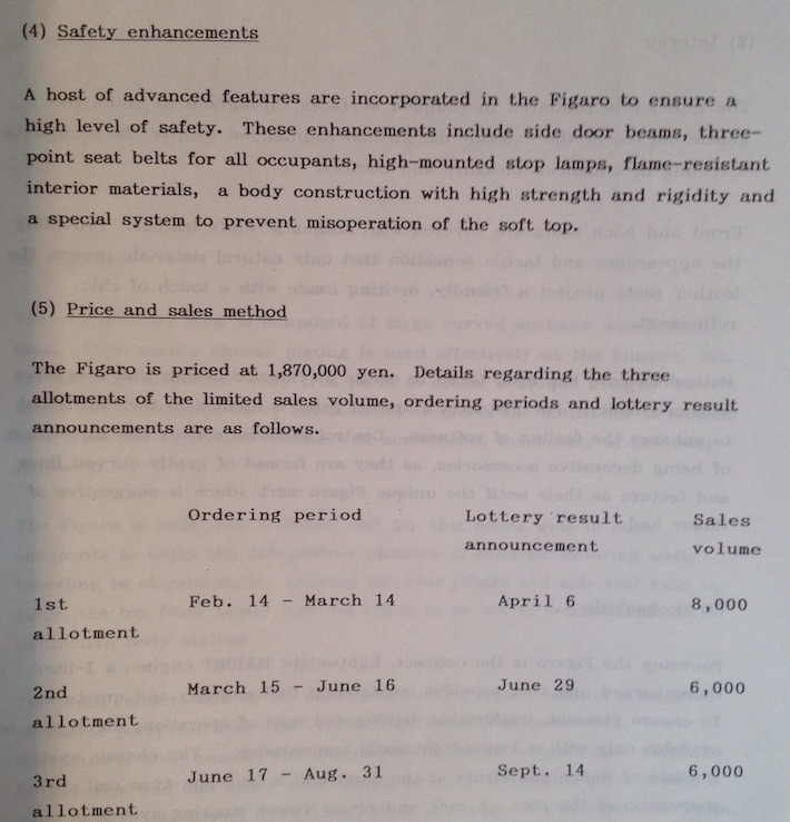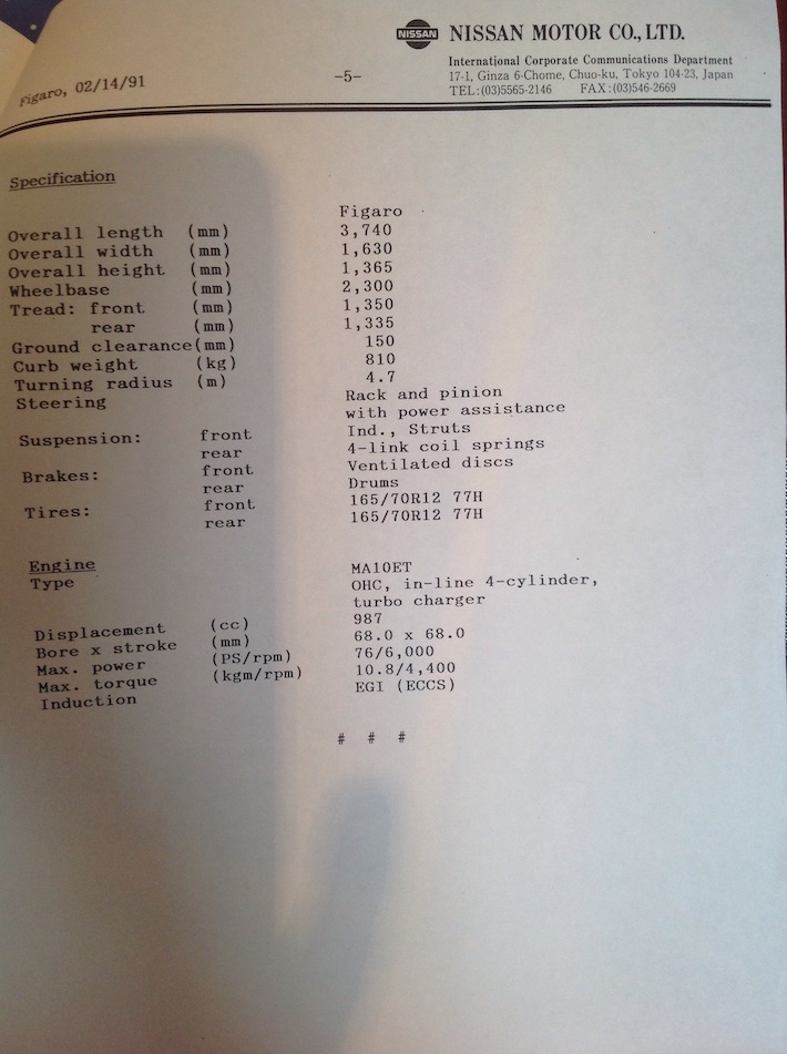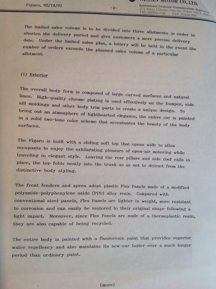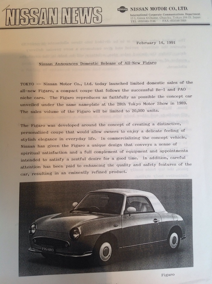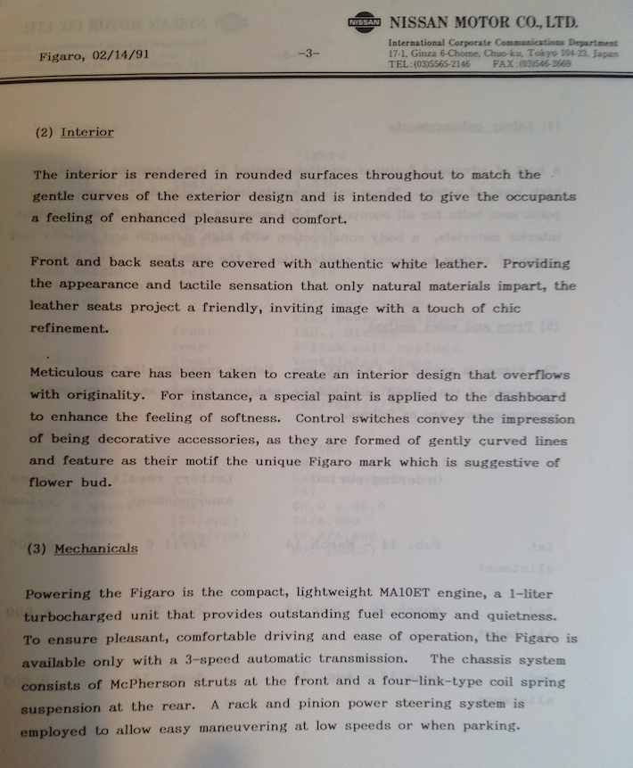 On the 14th February 1991 NISSAN NEWS (which was the official media channel of Nissan Motor Co Ltd) published a 5 page press release telling the world about the Figaro. If you read the release it contains some real gems such as; “Nissan has given the Figaro a unique design that conveys a sense of spiritual satisfaction and a full complement of equipment and appointments intended to satisfy a zestful desire for a good time”.  On the technical side the release talks about the advantages of using “plastic ‘Flex Panels’ made of a modified polyamide-polyphenylene oxide” (PPO) alloy resin for the front wing. It goes on to mention that “meticulous care has been taken to create an interior design that overflows with originality” within the cabin.