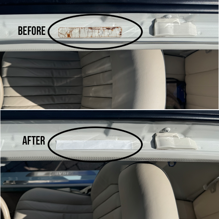 If you pull your roof back, you will see two plastic protection strips located within the gutter area. These are often discoloured due to age. The strip provides protection when the white roof handle sits on the roof.