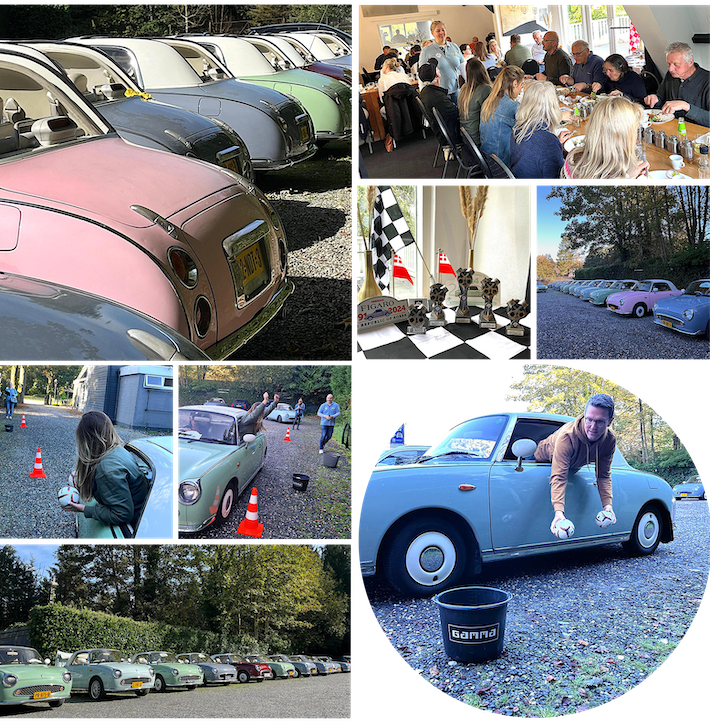 The beautiful roads over the Utrechtse Heuvelrug brought them back to Brocant for a magnificent lunch and a small quiz with questions about the area, Nissan, the Nissan Figaro and some well-known people, born in Utrecht. The most difficult question was; Why is the number 23 so special for Nissan? Do you know the Answer?